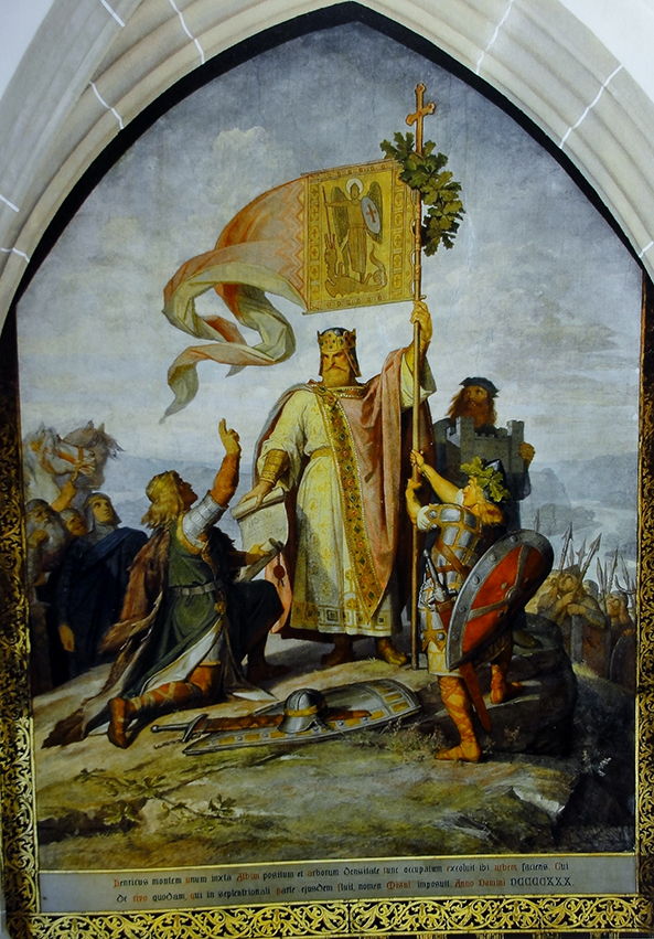 In de jaren 780 besteedt Karel de Grote een groot deel van zijn militaire inspanningen aan de onderwerping van de Saksen. 4500 personen worden onthoofd en 12000 vrouwen en kinderen weggevoerd. De Saksische leider Widukind ontspringt echter de dans en vindt bescherming bij de Friezen en de Denen. In die tijd verplichten de Franken de Saksen zich te bekeren tot het katholicisme. Wie nog heidense praktijken beoefent, wacht de doodstraf. De orde wordt hersteld in Saksenland. Ook Widukind bekeert zich, maar toch is de kerstening slechts oppervlakkig.