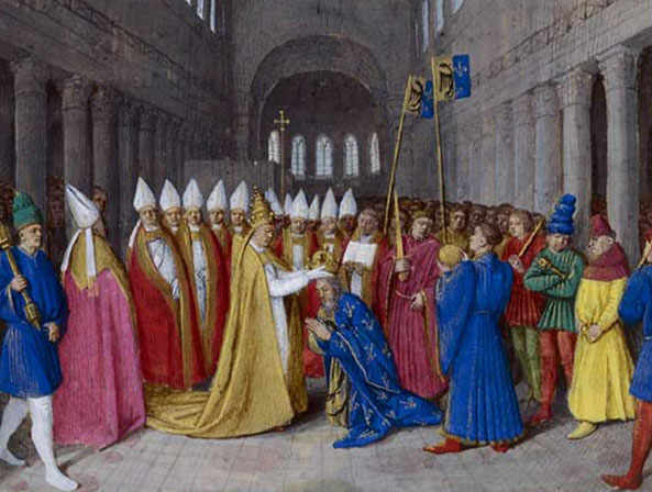 Op Kerstdag 800 zet paus Leo III in de Sint-Pietersbasiliek te Rome de keizerskroon op het hoofd van Karel de Grote, die vervolgens door de aanwezigen wordt uitgeroepen tot keizer. Deze ceremonie gooit de traditionele volgorde van de kroning, zoals die werd georganiseerd door het Romeinse protocol, door elkaar. Deze begon met het uitroepen van de keizer, en daarna pas ging de pontifex tot de wijding over. Zo werd benadrukt dat de kroon werd toegekend krachtens de wil van het volk en dankzij de militaire macht en successen van de gekroonde. De voorafgaande tussenkomst van de paus symboliseert integendeel de goddelijk en religieuze grondslag van de wereldlijke macht. Deze visie is allesbehalve naar de zin van Karel de Grote, die zich op het ogenblik van zijn wijding behoorlijk kwaad maakt.