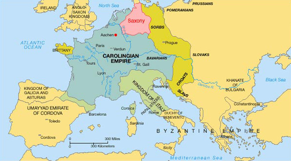Met de tactische beslissing om zich te beperken tot de inlijving van de Saksen in het grote Frankische rijk, werd meteen ook de basis gelegd voor het latere Oostfrankisch-Saksische rijk dat na het Verdrag van Verdun in 843, in de lange periode dat Lodewijk de Duitser (♱ 876) aan de macht was, vaste vorm kreeg. Het latere Duitsland - de 'tiutsche landen' - is ondenkbaar zonder Saksen, dat er als kernzone tussen Rijn en Elbe in de tijd van Karel werd aan toegevoegd. De 'natte grenzen' tussen west en oost vormden ook een soort taalgrens doorheen de verschillende dialecten. Ten oosten van Rijn en Moezel bestonden er wel taalgebieden die aansluiting vonden in het westen, er werd een Romaanse taal gesproken die uit het volkse Latijn was ontstaan. Ten oosten van Rijn en Main domineerden vroege stadia van wat later Nederduits zou worden genoemd, en Opperduitse dialecten die pas vele eeuwen later een gemeenschappelijke gesproken en geschreven taal zouden vormen.